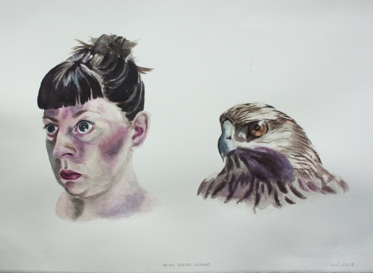 My face, bird face is a series of watercolours, which investigate the ways we anthropomorphize animals through our own impersonation of them. In this series, birds are depicted with their natural expressions while I conjure emotions and contort my face to look like them. The birds I have painted (turkey vulture, hawk, owl, and goose)…